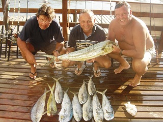 O mês de março, que já tinha começado com boas pescarias na região de Piçarras, continua com bons números e nesta semana foi a vez dos dourados serem fisgados pelas equipes da MBV, sendo a sua maioria embarcados mais próximo da costa na faixa dos vinte metros. As equipes Prosit, M10 do Clube do Barco e Grece Andressa foram as que mais embarcaram, com destaque para Adilson, comandante da equipe Grece Andressa, que acabou marcando 99 pontos para a classificação do campeonato assumindo a terceira posição da etapa de março. Confira na Galeria de Fotos todas as imagens das equipes da MBV deste mês de março e também todas as demais desta temporada.