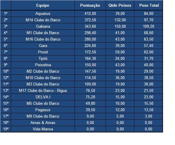 Após quatro etapas realizadas, confira abaixo como ficou a classificação geral do campeonato de pesca de 2013. As equipes Aquarius e M14 do Clube do Barco se mantiveram nas primeiras posições e a equipe Gabiana encostou nos lideres. A liderança do maior peixe do campeonato até o momento continua com a equipe Aquarius- um dourado 14,50 kg fisgado na segunda etapa.
