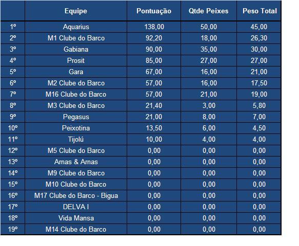 A equipe Aquarius (foto em destaque), com muitos dourados fisgados neste início de maio, larga na frente desta quinta etapa do ano marcando 138,00 pontos. As equipes M1 do Clube do Barco e Gabiana também fizeram boa pontuação ficando nas segunda e terceira colocação respectivamente. Confira abaixo a classificação parcial com a pontuação de todas as equipes que já saíram neste início de etapa e na galeria de fotos todas as imagens das equipes da MBV.