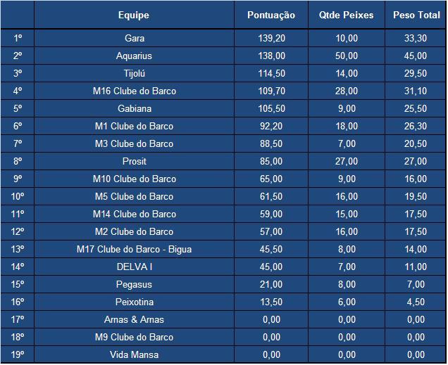 Confira abaixo a classificação parcial com a situação das equipes que já pontuaram nesta quinta etapa do ano. Neste último final de semana a equipe M16 do Clube fez ótima pescaria e subiu várias posições na classificação assumindo a quarta posição.
