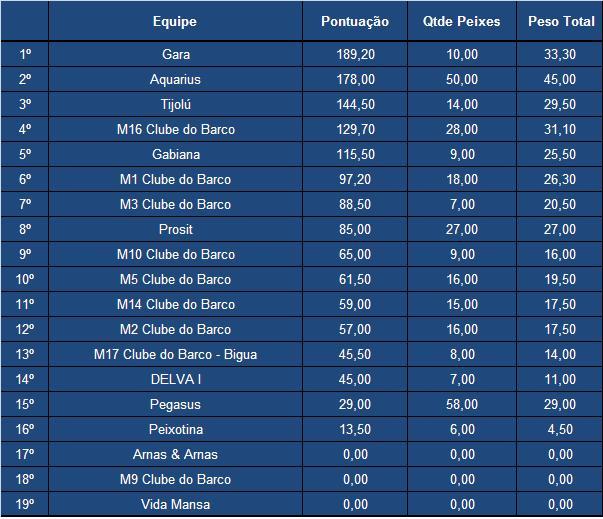 A equipe Gara (foto em destaque), com excelente pescaria de dourados realizada ao longo de maio, confirma a melhor pescaria deste mês e é a campeã da quinta etapa do campeonato acumulando mais 189,20 pontos. Com esta vitória a equipe também subiu duas posições na classificação geral assumindo agora a quarta colocação no ano. As equipes Aquarius e Tijolú ficaram nas segunda e terceira colocação respectivamente marcando 178,00 e 144,50 pontos nesta etapa. Confira abaixo a classificação final de maio com a pontuação de todas as equipes.