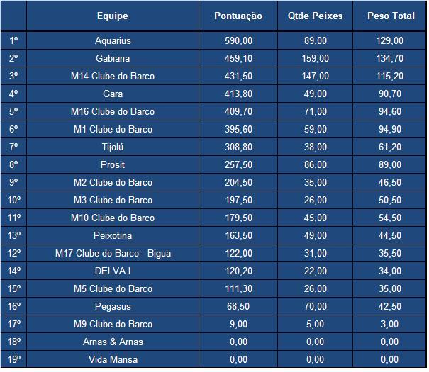 Após cinco etapas realizadas, confira abaixo como ficou a classificação geral do campeonato de pesca de 2013. A equipe Aquarius segue na liderança e a equipe Gabiana subiu mais uma posição e agora já o vice-líder no ano. O maior peixe do campeonato continua com a equipe Aquarius - um dourado de 14,5 kg fisgado na etapa de fevereiro.