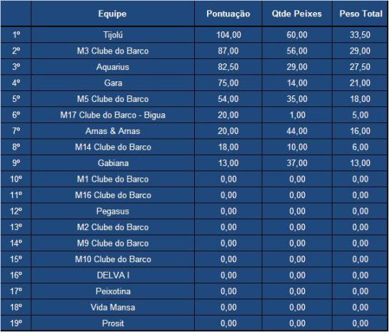 A equipe Tijolú (foto em destaque), com muitas sororocas fisgadas neste início de junho, larga na frente desta sexta etapa do ano marcando 104,00 pontos. As equipes M3 do Clube do Barco e Aquarius também fizeram boa pontuação neste início de etapa fazendo ótimas pescarias de sororocas e de dourados respectivamente. Confira abaixo a classificação parcial com a pontuação de todas as equipes que já saíram neste início de etapa e na Galeria de Fotos todas as imagens das equipes da MBV.