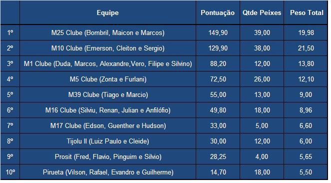 A equipe M25 do Clube do Barco (foto ao lado), com grande pescaria de anchovas entre outros peixes, realizada ao longo de Junho, confirma a melhor pescaria do mês e é a campeã da sexta etapa do campeonato de pesca da MBV de 2015 com 149,90 pontos. Com este resultado, a equipe M25 se manteve dentro do G8 na classificação geral do ano. Em segundo nesta etapa de Junho, também com pescaria de anchovas, ficou a equipe M10 do Clube do Barco (foto abaixo), que com este resultado subiu uma posição na classificação geral assumindo agora a quarta colocação. Confira abaixo a classificação final desta etapa com a situação de todas as equipes que pontuaram e na galeria de fotos todas as imagens das equipes da MBV de Junho.