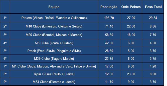 A equipe Pirueta (foto ao lado), com grande pescaria de sororocas realizada ao longo de Julho, confirma a melhor pescaria do mês e é a campeã da sétima etapa do campeonato de pesca da MBV de 2015 com 196,70 pontos. Com este resultado, a equipe Pirueta voltou a assumir a vice-liderança na classificação geral do ano. Confira abaixo a classificação final desta etapa com a situação de todas as equipes que pontuaram e na galeria de fotos todas as imagens das equipes da MBV de Julho.
