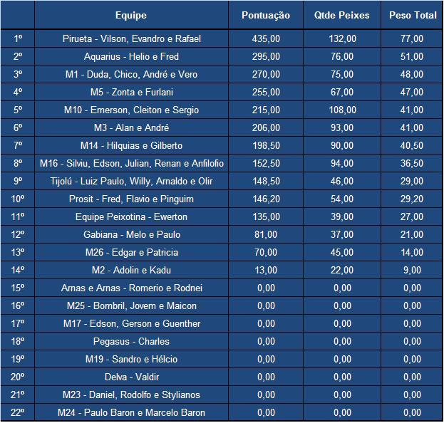 A equipe Pirueta (foto em destaque), com várias sororocas fisgadas em pescaria realizada ao longo de Julho, confirma a melhor pescaria do mês e é a campeã da sétima etapa do campeonato deste ano marcando 435,00 pontos. Com este resultado a equipe também subiu varias posições na classificação geral do ano saindo da 18ª para 09ª posição, lembrando que a equipe começou a participar do campeonato a partir apenas da etapa de Março. Na segunda colocação em Julho, com pescaria também de sororocas, ficou a equipe Aquarius com 295,00 pontos. Confira abaixo a classificação final desta etapa com a pontuação de todas as equipes. Confira também na galeria de fotos todas as imagens das equipes da MBV de Julho, que foi marcado pelas ótimas pescarias de sororocas e também de anchovas na região de Piçarras.