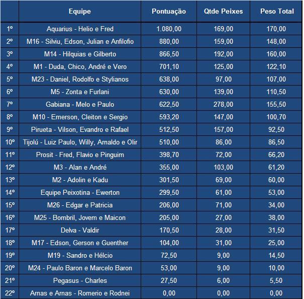 Após sete etapas realizadas, confira como ficou a classificação geral do campeonato de pesca da MBV de 2014. As equipes Aquarius, M16 e M14 do Clube se mantiveram nas primeiras posições e a equipe M1 subiu da sexta para quarta posição. A equipe M5 do Clube também subiu posições saindo da oitava para sexta posição. Quanto ao maior peixe do ano, a liderança continua com a equipe Aquarius, que fisgou um dourado de 11,5 kg na etapa de janeiro.