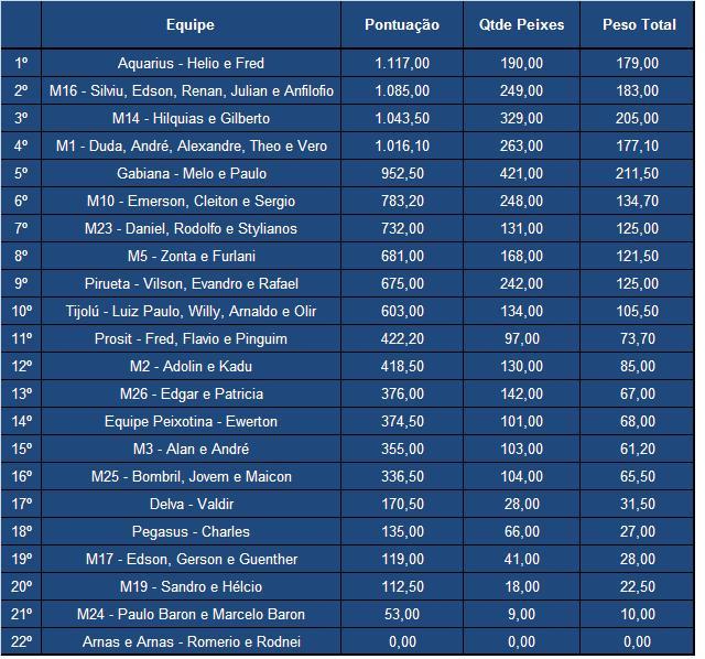 Após oito etapas realizadas, confira como ficou a classificação geral do campeonato de pesca da MBV de 2014. As equipes Aquarius, M16, M14 e M1do Clube se mantiveram nas primeiras posições e agora estão colados com poucos pontos de diferença esquentando a briga para as próximas etapas. As outras quatro equipes que estavam no G8 seguiram firme também após esta etapa, porém com variação de posições após a subida das equipes Gabiana e M10 do Clube. Outra equipe que vem crescendo no campeonato é a Pirueta, que agora está apenas seis pontos do G8. Quanto ao maior peixe do ano, a liderança continua com a equipe Aquarius, que fisgou um dourado de 11,5 kg na etapa de Janeiro.