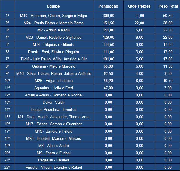 O mês de Outubro continua com boas pescarias na região de Piçarras com muitos dourados sendo embarcadas pelas equipes da Marina Bela Vista. Algumas equipes chegaram a fisgar anequins e também quem corricou pelas ilhas Feia e Itacolomi embarcou algumas sororocas. As melhores pescarias de dourados foram realizadas na quarta e quinta-feira onde várias equipes fizeram boa pontuação pelo campeonato. O principal destaque foi a equipe M10 do Clube do Barco (foto em destaque) que assumiu a liderança da etapa marcando 309,00 pontos com belos dourados embarcados em pescaria realizada na quinta-feira. Confira na Galeria de Fotos esta e todas as demais imagens das equipes desta semana e abaixo a classificação parcial da etapa de Outubro com a pontuação atualizada das equipes.