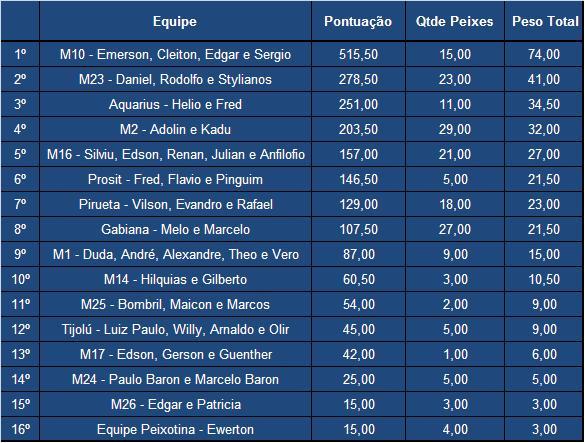 A etapa de Novembro do campeonato da MBV foi novamente marcada pelas belas pescarias de dourados e também de sororocas com muitos pontos marcados pela maioria das equipes. A equipe M10 do Clube do Barco (foto ao lado) acabou confirmando a melhor pescaria do mês e foi a campeã desta última etapa do ano marcando 515,50 pontos. Com este resultado a equipe subiu mais três posições na classificação geral terminando o ano no topo da tabela. Em segundo lugar nesta etapa ficou a equipe M23 do Clube (foto abaixo) que também fez grande pescaria marcando 278,50 pontos.  Confira na Galeria de Fotos do Portal da MBV estas todas as demais imagens das equipes desta etapa de Novembro.