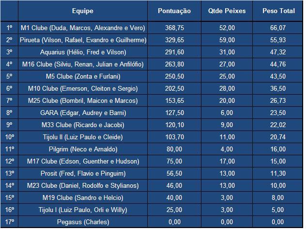 Após duas etapas realizadas, confira como ficou a classificação geral do campeonato de pesca da MBV de 2015. A equipe M1 do Clube (foto em destaque), que ficou em terceiro na etapa de Fevereiro, assumiu a liderança do campeonato passando a equipe Pirueta que foi a campeã da primeira etapa do ano. As demais equipes que também já estavam no G8, se mantiveram após esta etapa. Quanto ao maior peixe do ano, a liderança continua com a equipe M5 do Clube, que fisgou um dourado de 11,00 kg na etapa de Janeiro.