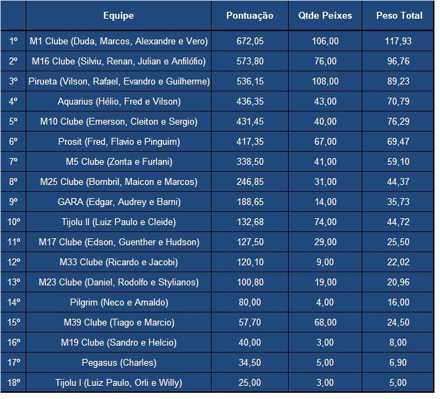 Após quatro etapas realizadas, confira como ficou a classificação geral do campeonato de pesca da MBV de 2015. A equipe M1 do Clube do Barco (foto em destaque), que ficou em segundo agora na etapa de Abril, voltou a assumir a liderança do campeonato deste ano ocupando o lugar da equipe Pirueta. Na realidade, as duas equipes vêm revezando a liderança neste início de ano. A Pirueta estava em primeiro no final das etapas de Janeiro e Março, e a M1 do Clube em Fevereiro e agora após a etapa de Abril. Outro destaque também do ano até o momento é a equipe M16 do Clube que assumiu a vice-liderança. Quanto ao maior peixe do ano, a liderança continua com a equipe M5 do Clube, que fisgou um dourado de 11,00 kg na etapa de Janeiro.