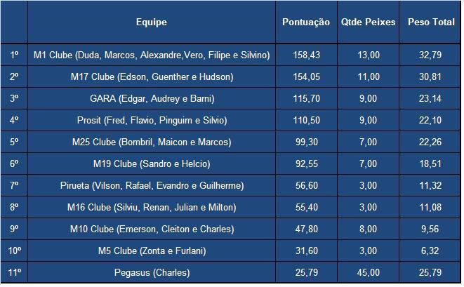 Faltando apenas alguns dias para encerrar a etapa de Novembro e última do ano, várias equipes ainda têm saídas em aberto para marcar pontos e poder melhorar sua classificação na tabela geral ou para ainda fisgar o maior peixe do ano. A principal disputa segue entre as duas equipes primeiras colocadas na classificação geral, Pirueta e M1 do Clube do Barco. A equipe M1 já fez as duas saídas permitidas desta etapa e considerando a pontuação geral até o momento, está vencendo esta etapa e também se consagrando a campeã do ano. Entretanto, a equipe Pirueta ainda tem uma saída em aberto e, por estar bem próximo na pontuação geral, pode mudar o resultado até o final deste mês. Se o campeonato terminasse hoje, a equipe M1 terminaria o ano com 1.529,73 pontos e a Pirueta com 1.509,60 pontos, porém a disputa está emocionante e somente teremos a definição nos próximos dias, pois além da Pirueta, outras equipes que apesar de estarem mais longe na classificação, ainda podem surpreender e subir posições. Confira abaixo como está a classificação parcial desta etapa de Novembro até o momento.