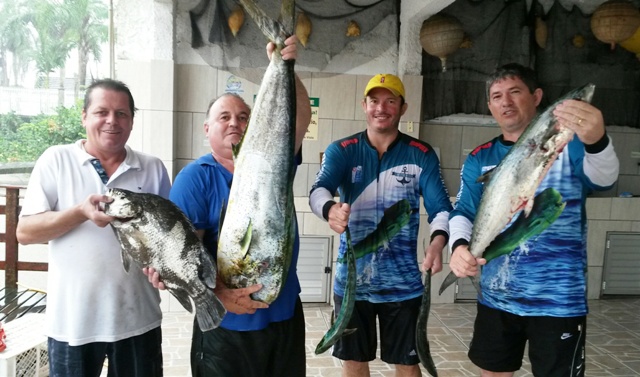 Apesar do tempo mais instável desse início de ano, nesse final de semana as condições melhoraram e algumas equipes já saíram pelo campeonato e marcaram os primeiros pontos deste ano. Um dos destaques foi a equipe Gara (foto ao lado) que largou na frente marcando 112,95 pontos com pescaria de dourados e sororocas. Um dos dourados chegou a pesar 7,930 kg e até no sábado era o maior peixe do campeonato. Já no domingo foi a vez da equipe M41 do Clube do Barco (foto abaixo) sair para sua primeira pescaria nesse ano e acabou fisgando o maior peixe do campeonato até o momento, um dourado de 9,400 kg. A equipe também fisgou outros dourados além de sororoca e prejereba e assumiu a vice colocação da etapa de Janeiro com 97,00 pontos. Confira abaixo a classificação parcial com a situação das equipes que já pontuaram neste início da primeira etapa de 2016. Confira também na galeria de fotos do Portal da MBV todas as imagens das equipes deste início de ano.