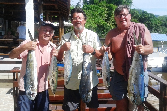 Apesar da primeira semana de Janeiro ter sido de mar agitado e poucas pescarias, esta segunda semana já foi de tempo bom e de muitos peixes na região de Piçarras. As equipes da Marina Bela Vista fizeram ótimas pescarias fisgando principalmente dourados, sororocas, prejerebas e cações. Algumas equipes embarcaram também alguns exemplares de xaréu branco. Um, entre os vários destaques dessa semana, foi o Mestre Silviu que tem realizado grandes pescarias em Piçarras. Em uma de suas pescarias nessa semana (foto acima), a equipe fisgou um belo dourado de 12,320 kg. O Mestre Silviu, que organiza pescarias saindo da Marina Bela Vista, fica a disposição para quem tiver interesse em pescar na região de Piçarras através do site www.mestresilviu.com.br ou em contato direto com a Marina Bela Vista. Outro destaque desta semana foi a equipe Prosit (foto abaixo) que com bela pescaria de dourados e sororocas assumiu a vice liderança desta primeira etapa do campeonato marcando 107,10 pontos. Outras equipes que saíram pelo campeonato também pontuaram, conforme classificação no quadro abaixo. Confira também na Galeria de Fotos no Portal da MBV estas e todas as demais imagens das equipes deste início de mês que já começou com muitos peixes em Piçarras.