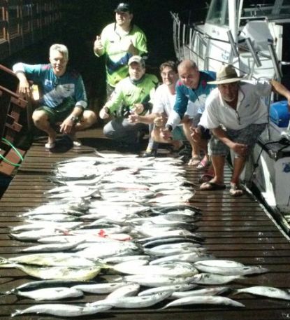 O mês de Abril segue com muitos peixes na região de Piçarras. Além dos dourados, que até agora vinha sendo o principal peixe do mês, as equipes da Marina Bela Vista (MBV) fisgaram nessa semana muitas anchovas e bicudas em pescarias noturna realizada a bordo do Mestre Silviu. Em uma de suas saídas, na quinta-feira, o Mestre com uma equipe de pescadores da MBV embarcou além de muitas bicudas e anchovas, dourados e prejereba (foto ao lado). Já na sexta-feira, outra bela pescaria com o pessoal da MBV, agora embarcando também cavalas de bom porte (foto abaixo). O Mestre Silviu continua sendo uma excelente opção em Piçarras pra quem gosta de pescar, inclusive para pescarias noturnas. Quem tiver interesse em pescar com o Mestre Silviu pode agendar através do site www.mestresilviu.com.br ou em contato direto com a Marina Bela Vista. Confira também na Galeria de Fotos no Portal da MBV estas e todas as demais imagens das equipes deste mês.