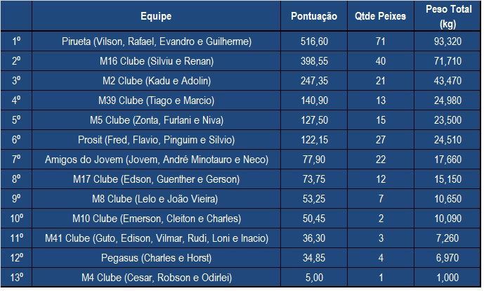 A equipe Pirueta (foto ao lado), com grande pescaria de dourados realizada no início de Abril, confirma a melhor pescaria do mês e é a campeã da quarta etapa do campeonato de pesca da MBV marcando 516,60 pontos. Com este resultado, a equipe Pirueta subiu várias posições na classificação geral assumindo agora a vice-liderança no ano. Em segundo nesta etapa de Abril com 398,55 pontos, também embarcando belos dourados em pescaria realizada no início do mês, ficou a equipe M16 do Clube do Barco que segue na liderança na tabela geral do ano. Outro destaque nessa etapa foi a equipe M10 do Clube do Barco (foto abaixo) que fisgou o maior peixe do campeonato até o momento, um dourado de 9,740 kg. Confira também abaixo a classificação final desta etapa com a situação das equipes que pontuaram no mês e na galeria de fotos no Portal da MBV todas as imagens das equipes de Abril.