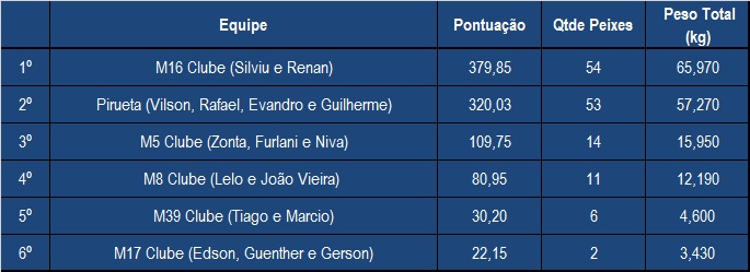 A equipe M16 do Clube do Barco (foto ao lado), com grande pescaria de sororocas realizada ao longo de Maio, confirma a melhor pescaria do mês e é a campeã da quinta etapa do campeonato de pesca da MBV com 379,85 pontos. Com este resultado, a equipe M16 segue firme na liderança da classificação geral no ano. Em segundo nesta etapa de Maio com 320,03 pontos, também embarcando belas sororocas, ficou a equipe Pirueta (foto abaixo). Confira abaixo a classificação final desta etapa com a situação das equipes que pontuaram no mês e na galeria de fotos no Portal da MBV todas as imagens das equipes de Maio.