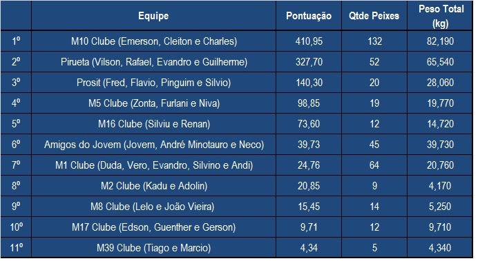 Essa última semana foi novamente de muitos peixes na região de Piçarras. Os principais peixes embarcados pelas equipes da Marina Bela Vista (MBV) foram sororocas, espadas e bonitos. Um dos destaques foi a equipe M10 do Clube da MBV (foto ao lado) que fez grande pescaria nesse sábado pelo campeonato marcando 410,95 pontos e assumindo a liderança parcial da etapa de Junho. Outras equipes que também saíram pelo campeonato marcaram pontos conforme tabela abaixo com a classificação parcial dessa sexta etapa do ano. Confira também na Galeria de Fotos no Portal da MBV estas e todas as demais imagens das equipes deste mês até o momento.
