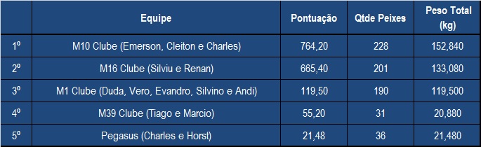 Nessa semana na região de Piçarras, ao contrário do que foi o início do mês onde foram fisgados também sororocas, bonitos e anchovas, as equipes da MBV conseguiram os melhores resultados apenas com as pescarias de espadas, tanto durante o dia como também a noite. Um dos destaques foi a equipe M1 do Clube do Barco (foto ao lado) que fez grande pescaria nesse sábado pelo campeonato marcando 119,50 pontos e assumindo a terceira colocação da etapa de Julho. Já outras equipes que também saíram pelo campeonato acabaram não pontuando nessa semana. A tabela parcial de Julho segue abaixo com a classificação dessa sétima etapa do ano até o momento. Confira também na Galeria de Fotos no Portal da MBV esta e todas as demais imagens das equipes deste mês até o momento.