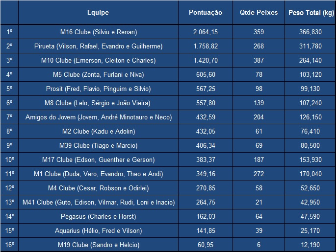 Após oito etapas realizadas, confira como ficou a classificação geral do campeonato de pesca da MBV de 2016. A equipe M16 do Clube do Barco, que acabou não pontuando na etapa de Agosto, segue na liderança do campeonato deste ano com 2.064,15 pontos. A equipe Pirueta, que venceu a oitava etapa desse ano, segue na vice-liderança, porém agora mais próxima da líder acumulando 1.758,82 pontos. A equipe M10 do Clube, que também não pontuou em Agosto, continua na terceira posição com 1.420,70 pontos. As outras cinco equipes que estavam no G8 se mantiveram após essa última etapa, com destaque para as equipes M5 do Clube, que subiu da sexta para a quarta colocação, e a Amigos do Jovem que subiu uma posição assumindo a sétima posição. Quanto ao maior peixe do ano, a liderança continua com a equipe M10 do Clube, que fisgou um dourado de 9,740 kg na etapa de Abril.