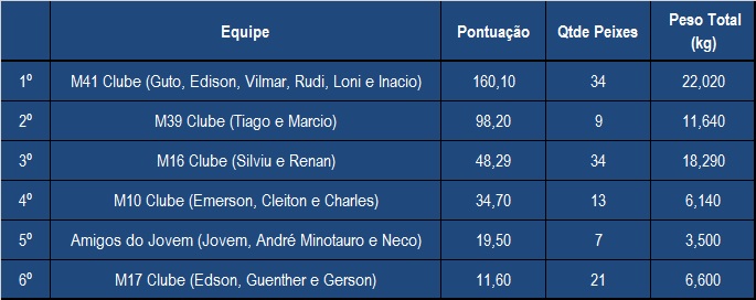 A equipe M41 do Clube do Barco (foto ao lado), com pescaria realizada no dia 19 deste mês, confirma a melhor pescaria de Outubro e é a campeã da décima etapa do campeonato de pesca da MBV marcando 160,10 pontos. Com este resultado, a equipe M41 subiu algumas posições na classificação geral do ano chegando agora na décima colocação bem perto da pontuação das equipes que estão no G8. Em segundo nesta etapa de Outubro com 98,20 pontos ficou a equipe M39 do Clube do Barco (foto abaixo), que com esse resultado entrou no G8 assumindo agora a sétima colocação na classificação geral. Confira abaixo a classificação final desta etapa com a situação das equipes que pontuaram no mês e na galeria de fotos no Portal da MBV todas as imagens das equipes de Outubro.