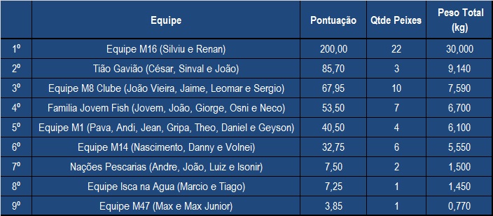 A sétima etapa do campeonato de pesca da Marina Bela Vista desse ano foi de muitas pescarias ao longo do mês de Julho com muitos peixes sendo fisgados pelas equipes da MBV. Os principais peixes embarcados nessa etapa foram as sororocas, porém também foram fisgados vários dourados e mecas ao longo do mês. A equipe M16 do Clube do Barco (foto ao lado), com linda pescaria de sororocas nessa última semana do mês, acabou confirmando a melhor pescaria de Julho e foi a campeã da sétima etapa do campeonato de pesca da MBV de 2017 marcando 200,00 pontos. Com este resultado, a equipe M16 segue firme na liderança da classificação geral do ano. Em segundo nesta etapa de Julho ficou a equipe Tião Gavião que marcou 85,70 pontos e em terceiro a equipe M8 do Clube com 67,95 pontos. Confira abaixo a classificação final desta etapa com a situação das equipes que conseguiram pontuar nesse mês.