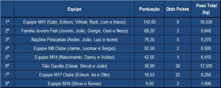 A nona etapa do campeonato de pesca da Marina Bela Vista desse ano acabou sendo de muitas pescarias na região de Piçarras, apesar dos vários dias de tempo instável ao longo do mês de Setembro, que até é normal para essa época do ano na região. Muitos peixes foram fisgados pelas equipes da MBV, com destaque para os dourados que a maioria das equipes embarcaram. Sororocas, anchovas e novamente algumas mecas também foram fisgadas por algumas equipes. A equipe M41 do Clube do Barco (foto ao lado) acabou confirmando a melhor pescaria de Setembro e foi a campeã da nona etapa do campeonato de pesca da MBV de 2017 marcando 142,65 pontos. Com este resultado, a equipe M41 subiu duas posições na classificação geral do ano assumindo agora a terceira colocação. Em segundo nesta etapa de Setembro ficou a equipe Família Jovem Fish que marcou 89,20 pontos e em terceiro a equipe Nações Pescarias marcando 76,35 pontos. Confira abaixo a classificação final desta etapa com a situação das equipes que conseguiram pontuar nesse mês e na galeria de fotos do Portal da MBV todas as imagens das pescarias de Setembro.