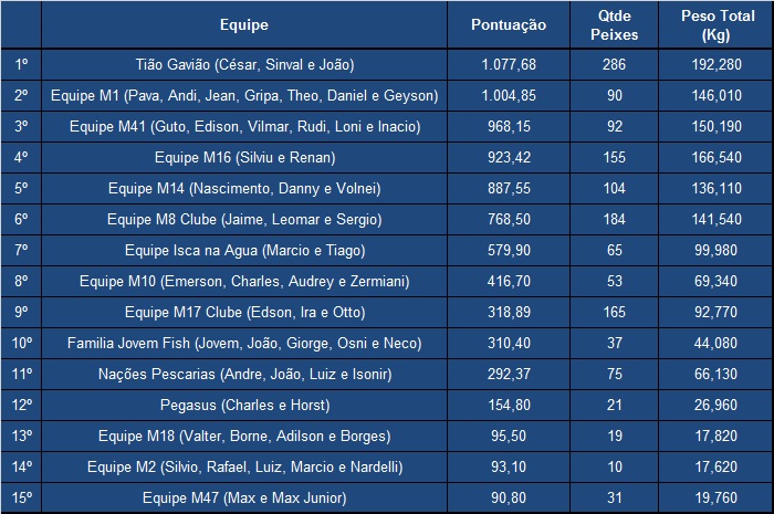 No sábado de 02 de Dezembro foi realizada a festa de confraternização de fim de ano da Marina Bela Vista e também a entrega da premiação do campeonato de pesca de 2017. Das quinze equipes participantes do campeonato deste ano, as oito primeiras colocadas e a equipe do maior peixe receberam os troféus da MBV. Conforme resultado final do campeonato abaixo, a equipe campeã desse ano foi a Tião Gavião e o maior peixe foi fisgado pela equipe Isca na Agua. A festa foi novamente um sucesso com uma grande confraternização entre todas as equipes da MBV que participaram do evento. Durante o sábado, as equipes também puderam saborear um delicioso churrasco e curtir também a música do Leo Mattos. A equipe da MBV agradece a presença de todos em mais um evento de confraternização e convida a todos para estarem juntos no próximo ano continuando a fazer parte da família Marina Bela Vista. Confira na Galeria de Fotos todas as imagens do evento.